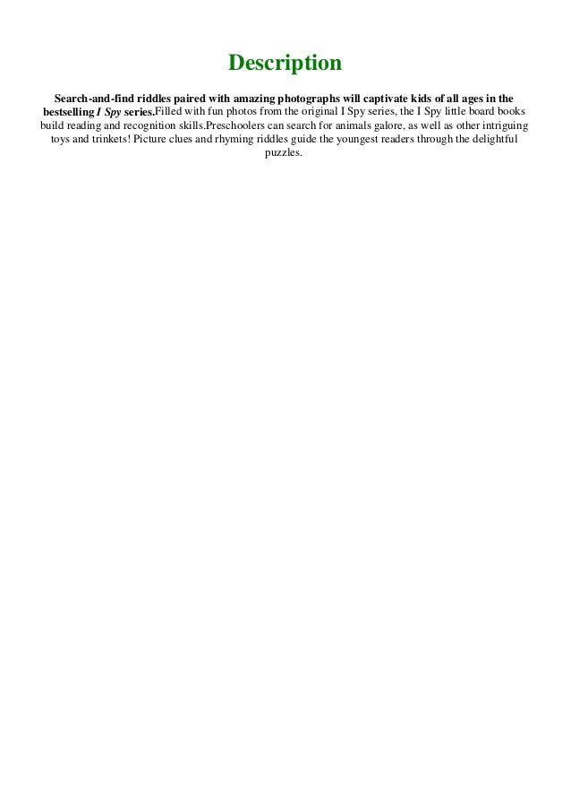 I Spy A Book Of Picture Riddles Jean Marzollo Free Download Borrow And Streaming Internet Archive from archive.org The beauty of these books, which include i spy funhouse and i spy gold challenger, is that when the initial riddle is solved, there are still extra credit riddles in the back, as well as countless other games of varying degrees of difficulty any imaginative. This is a free site for get free i spy fun house: Todos los formatos de libros son aptos para dispositivos móviles. This bestselling book features riddles that send readers searching through 13 photographs to find hidden objects. Laden sie dieses buch i spy christmas: Riddles ebooks free, i spy: Find the complete i spy: Your current browser isn't compatible with soundcloud.